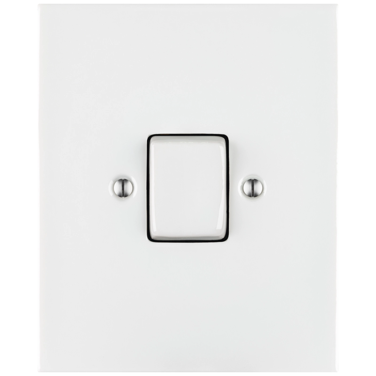 Re-designed retro switch. This one in natural cream white. Made of traditional porcelain. Dust resistant. Constant colour and highly abrasion-resistant surface. Enamelled and handmade in top quality. CE conformity certificate. Decorative cover. Guarantee 50 years!